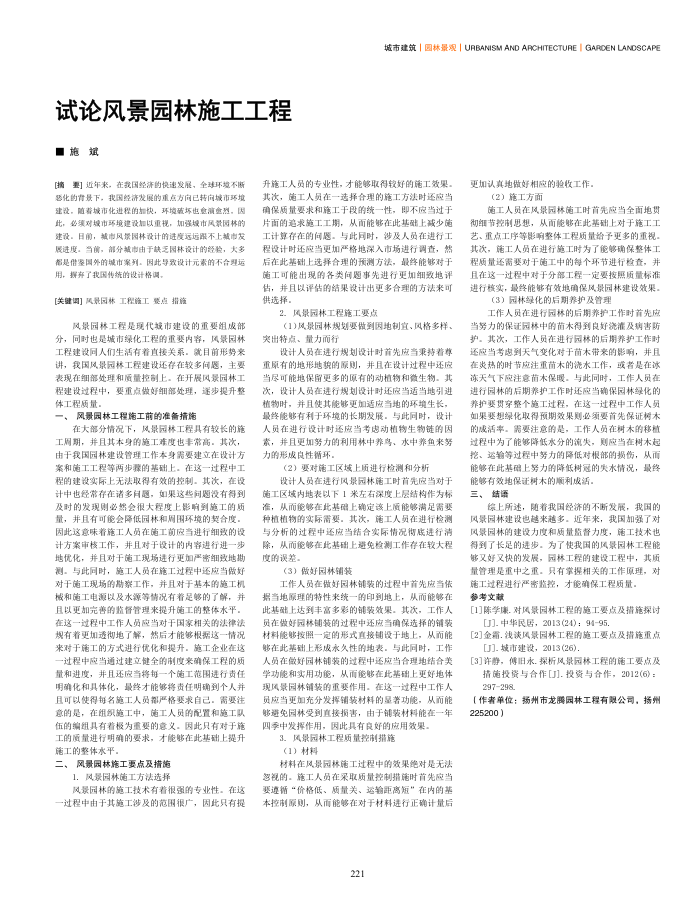 [2]金霜.浅淡风景园林工程的施工要点及措施重点[J].城市建设,2013 (26)