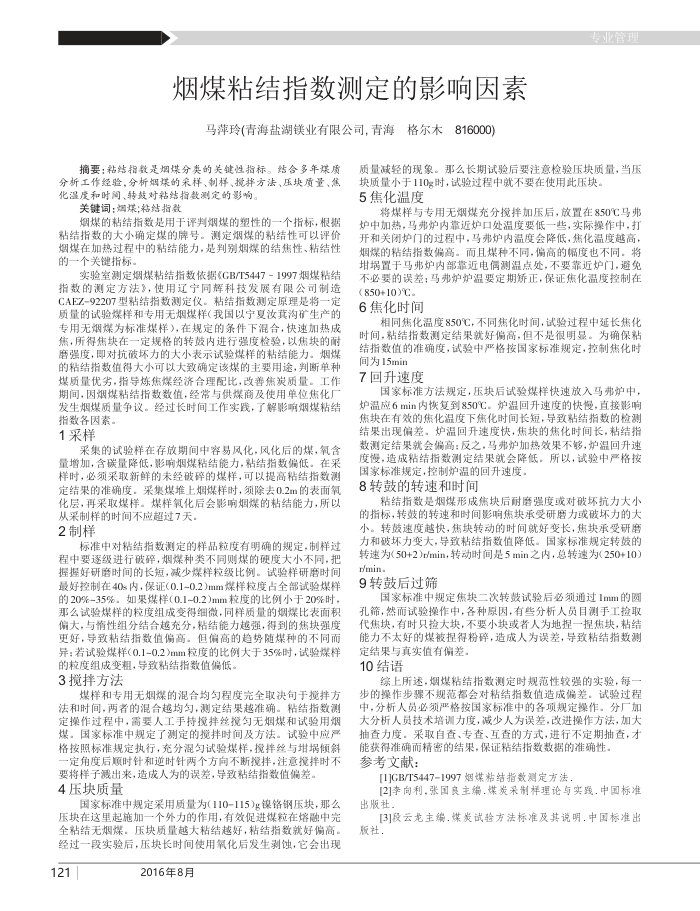 烟煤粘结指数测定的影响因素马萍玲(青海盐湖镁业有限公司,青海格尔木816000)