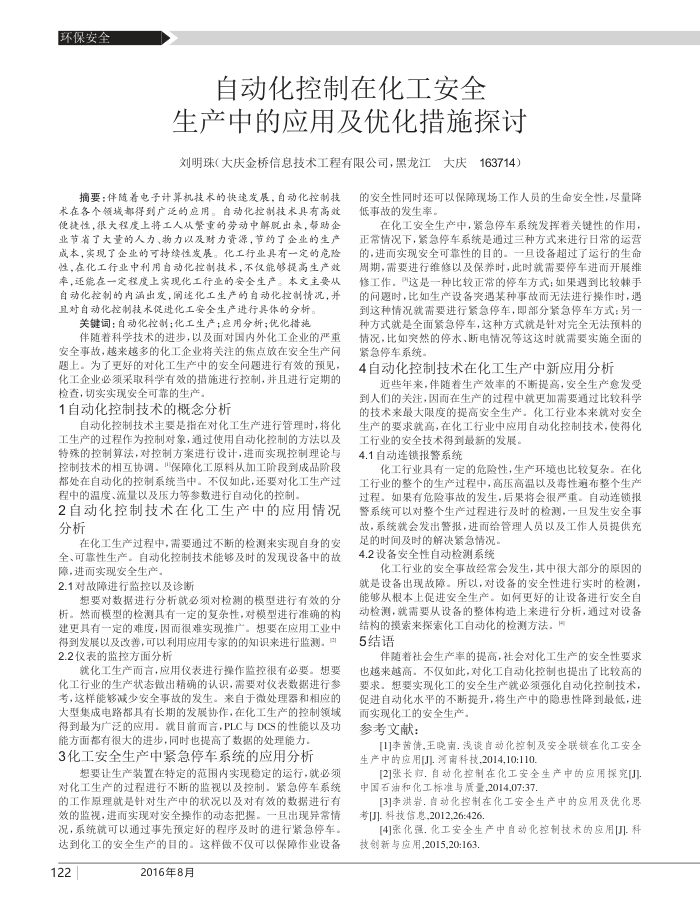 [2]张长归.自动化控制在化工安全生产中的应用探究[J] 中国石油和化工标准与质量,2014,07:37