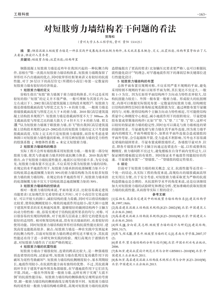 目前对于短肢剪力墙的相关概念、定义、抗震性能等还没有一个统一的结论,从实际工程的角度来说,高规给出的墙肢截面高厚比实用且方使,出于要全考虑,对短肢剪力墙采取更为严格的抗展构造措施也是合理的。从抗震科学水平的角度来说,还是应该继续加大对短肢剪力墙的试验研究和理论分析,更加准确的获取短肢剪力墙的抗震性能,从而指导实际工程的设计。
