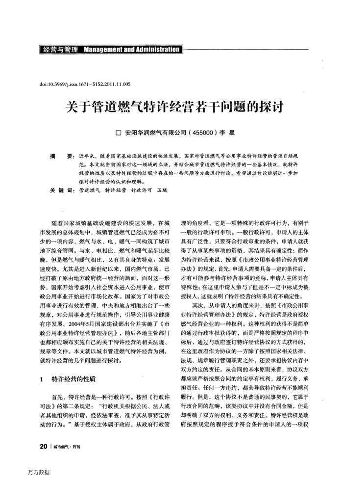范。本文就当前国家对这一领城的立法,并结合城市管道燃气特许经营的一些基本情况,就特许经营的性质以及特许经营的过程中存在的一些间题等方面进行讨论,希望通过讨论能够进一步加深对特许经营的认识和理解。