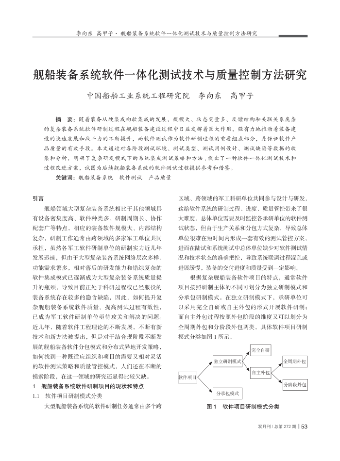 李向东高甲子·舰船装备系统软件一体化测试技术与质量控制方法研究