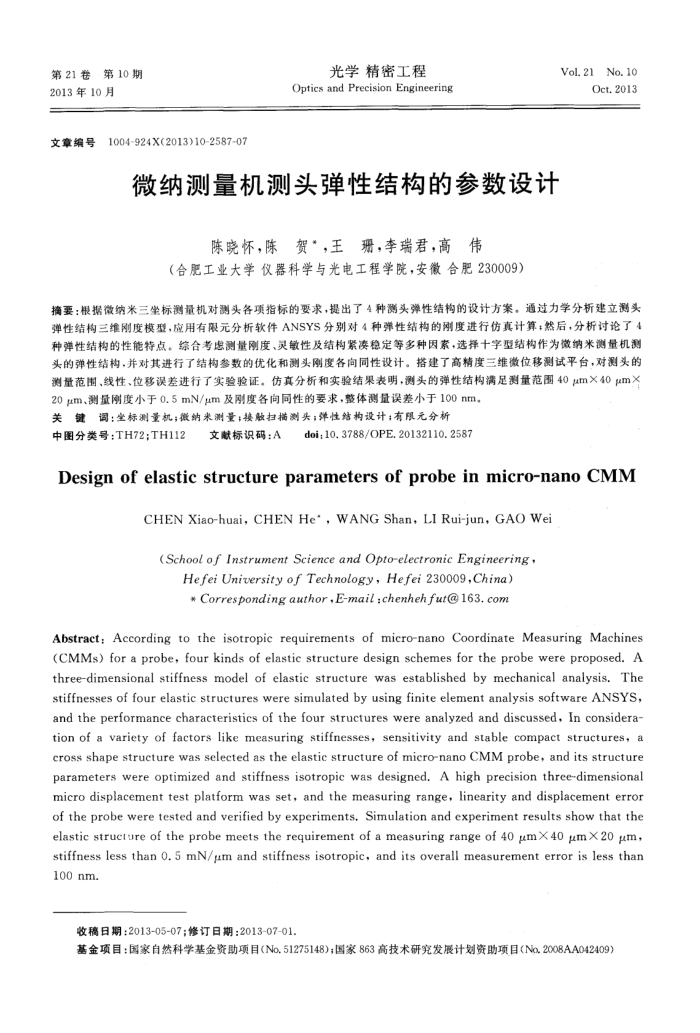 20μm、测量刚度小于0.5mN/μm及刚度各向同性的要求,整体测量误差小于100nm。关键调:坐标测量机;微纳来测量;接触担描测头;弹性结构设计;有限元分析