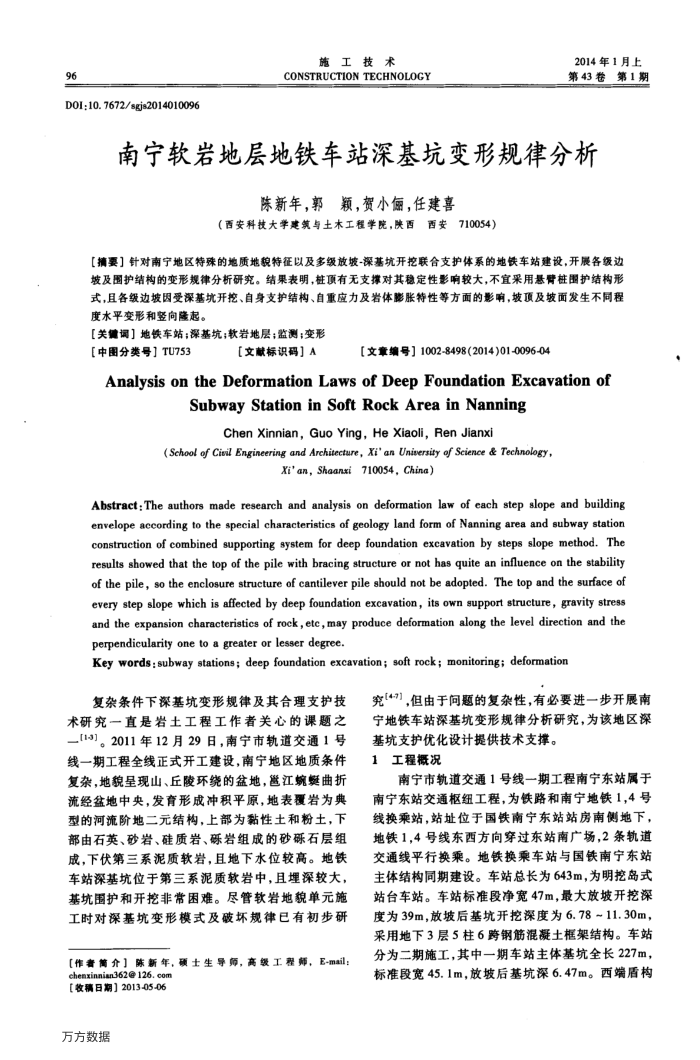 Key words:subway stations; deep foundation excavation; soft rock; monitoring; deformation