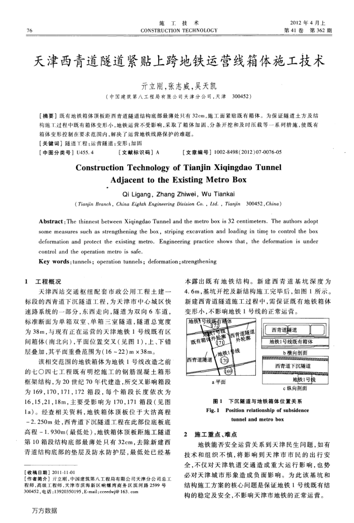 [捕要】既有地铁箱体顶板距西青道隧道结构底部最薄处只有32cm,施工面紧贴既有箱体。为保证隧道土方及结构施工过程中既有箱体变形小,地铁运营不受影响,采取了箱体加固、分条开挖和及时压载等一系列措施,使既有