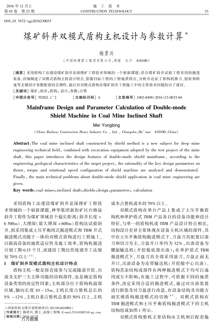 速等关键设计参数配置的合理性,最后对双模式盾构在煤矿斜井工程施工中的主要技术问题给出了建议[关键词]煤矿;斜并;盾构;设计:参数;计算