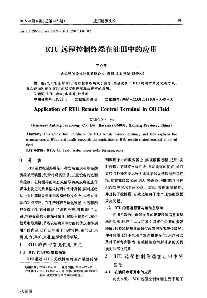 摘要:文中首先对RTU远程控制终端做了简介,然后说明了RTU的两种常见使用方式,最后详细阐述了RTU远程控制终端在油田中的应用。