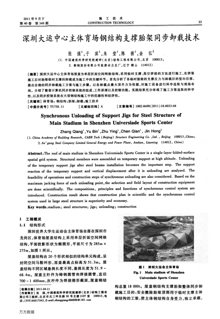 深圳大运中心主体育场钢结构支撑胎架同步卸载技术