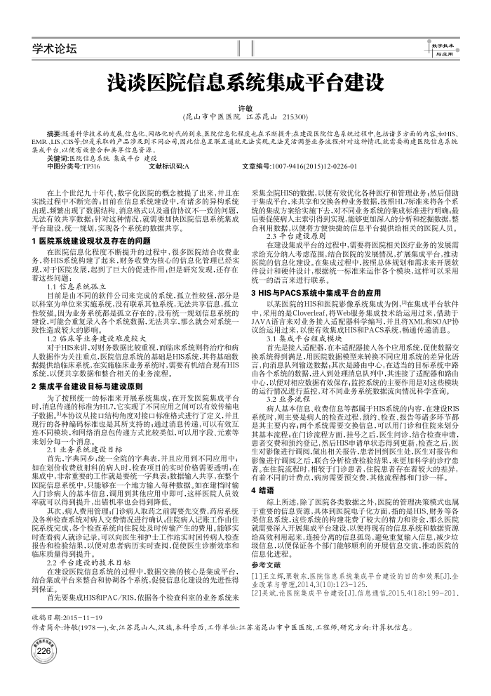 [2]吴斌.论医院集成平台建设[J].信息通信,2015,4(18):199-201,