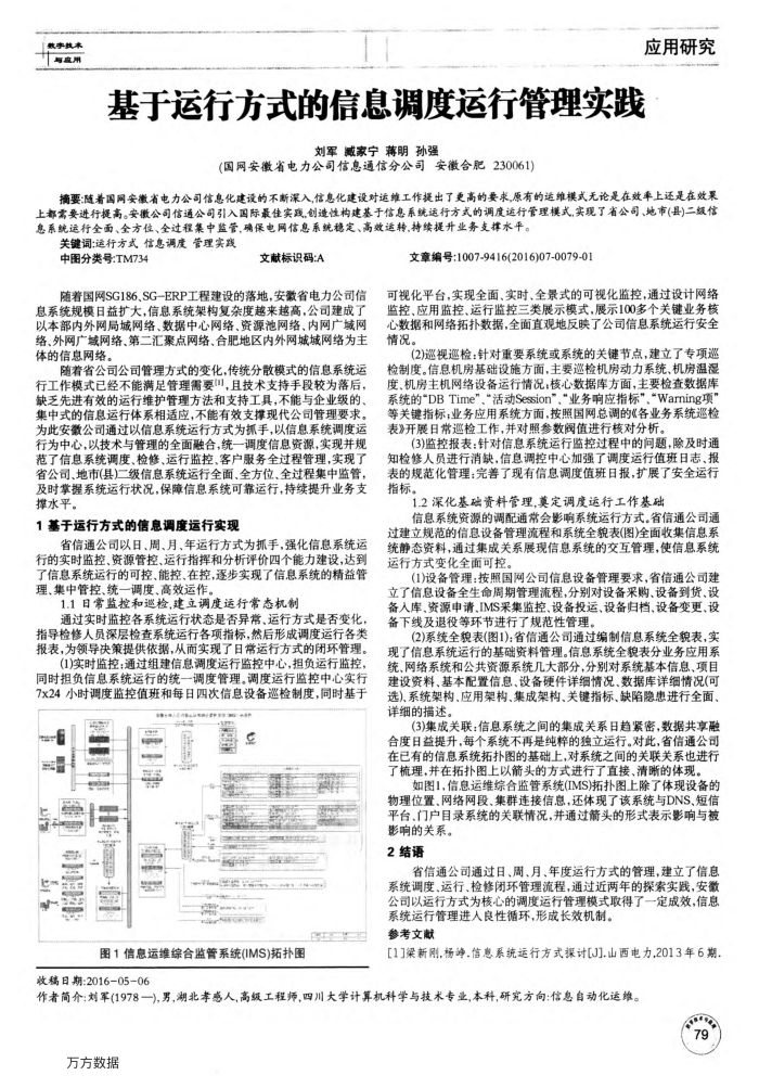 摘要:随着国网安徽省电力公司信息化建设的不断深入,信息化建设对运维工作提出了更高的要求,原有的运维模式无论是在效率上还是在效聚上都需要进行提高。安微公司信通公司引入国际最佳实践,创造性构建基于信息系统运行方式的调度运行管理模式,实现了省公司、地市(县)二级信息系统运行全面、全方位、全过程集中监管,确保电网信息系统稳定、高效造转,持续提升业务支撑水平。