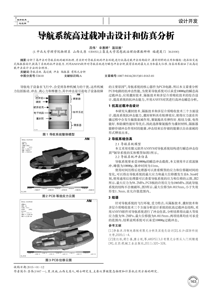 的主要原因"。导航系统的核心器件为PCB电路,所以本文着重分析 PCB电路的抗冲击性能。为使某导航系统可以承受10000g的瞬态高过载冲击,应用灌封技术、隔振技术和多层介质吸收技术的综合设计,提高系统的抗冲击能力。并用ANSYS对其进行高冲击瞬态分析。 1抗高过载冲击设计