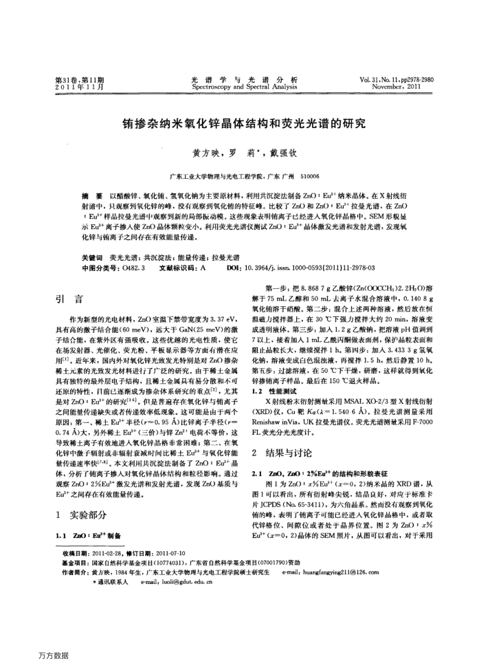 作为新型的光电材料,ZnO室温下禁带宽度为3.37eV,具有高的激子结合能(60meV),远大于GaN(25meV)的激子结合能,在紫外区有强吸收,这些优越的光电性质,使它在场发射器、光能化、灵光粉、平板晶示器等方面有潜在应用[1]。近年来,国内外对氧化锋光致发光特别是对ZnO掺杂稀土元索的光致发光材料进行了广泛的研究。由于稀土金属具有独特的最外层电子结构,且稀土金属具有易分散和不可还原的特性,目前已逐渐成为掺条体系研究的重点("),尤其是对ZnO:Eu+的研究(3")。但是誉遍存在氧化锌与销离子之间能量传递缺失或者传递效率低现象。这可能是由于两个原因:第、稀土Eu+半径(r=0.95A)比锌离子半径(r= 0.74A)大,另外稀土Eul*(三价)与锌Znt+电荷不等价,这导致稀土离子有效地进人氧化锌晶格非常困难;第二、在氧化锋中激子辅射或非辐射衰减时闻比稀土Eu+与氧化锌能量传递速率快17.8]。本文利用共沉淀法制备了ZnO·Eu+晶体,分析了销离子掺人对氧化锌晶体结构和粒径影响。通过观察ZnO:2%Eu+激发光谱和发射光谱,发现ZnO基质与