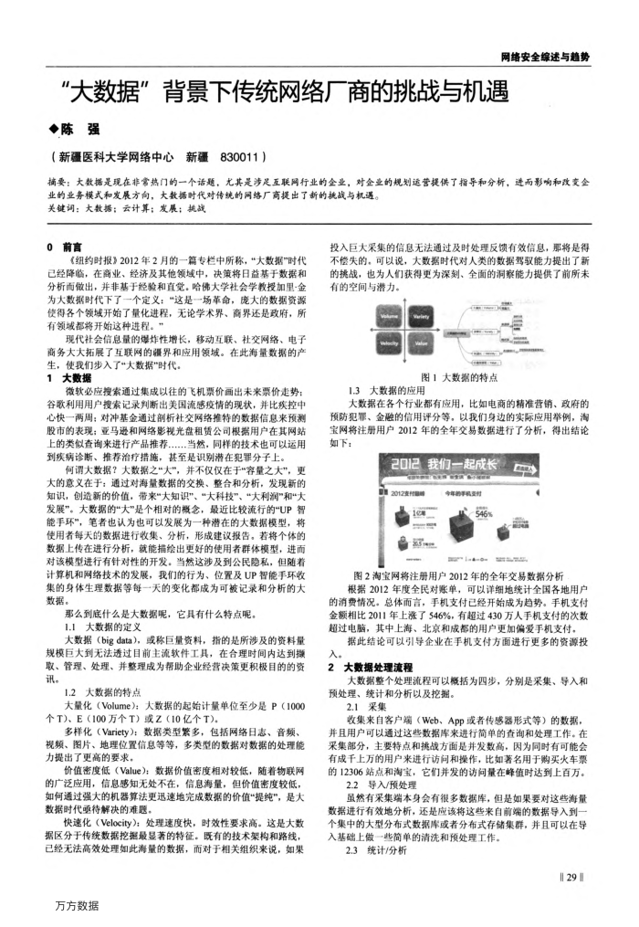 业的业务模式和发展方向,大数据时代对传统的网络厂商提出了新的桃战与机遇。关键调:大数据;云计算;发展;挑战