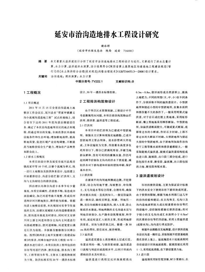 本文着重从溢洪道设计分析了延安市治沟造地排水工程的设计与运行。文章进行了洪水总量计 算、水力计算、溢洪道洪水演算,设计结果符合《陕西省黄土高原地区沟道造地工程建设规范(暂 行)》及《水土保持综合治理(技术规范)沟壑治理技术XGB/T16453.3—2008)设计要求。