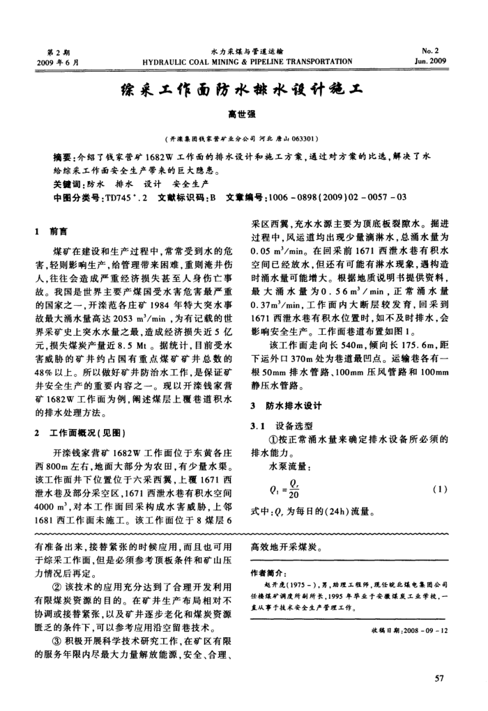 摘要 :介绍了钱家营矿1682W工作面的排水设计和施工方案 ,通过对方案的比选 ,解决 了水给综采工作面安全生产带来的巨大隐患。